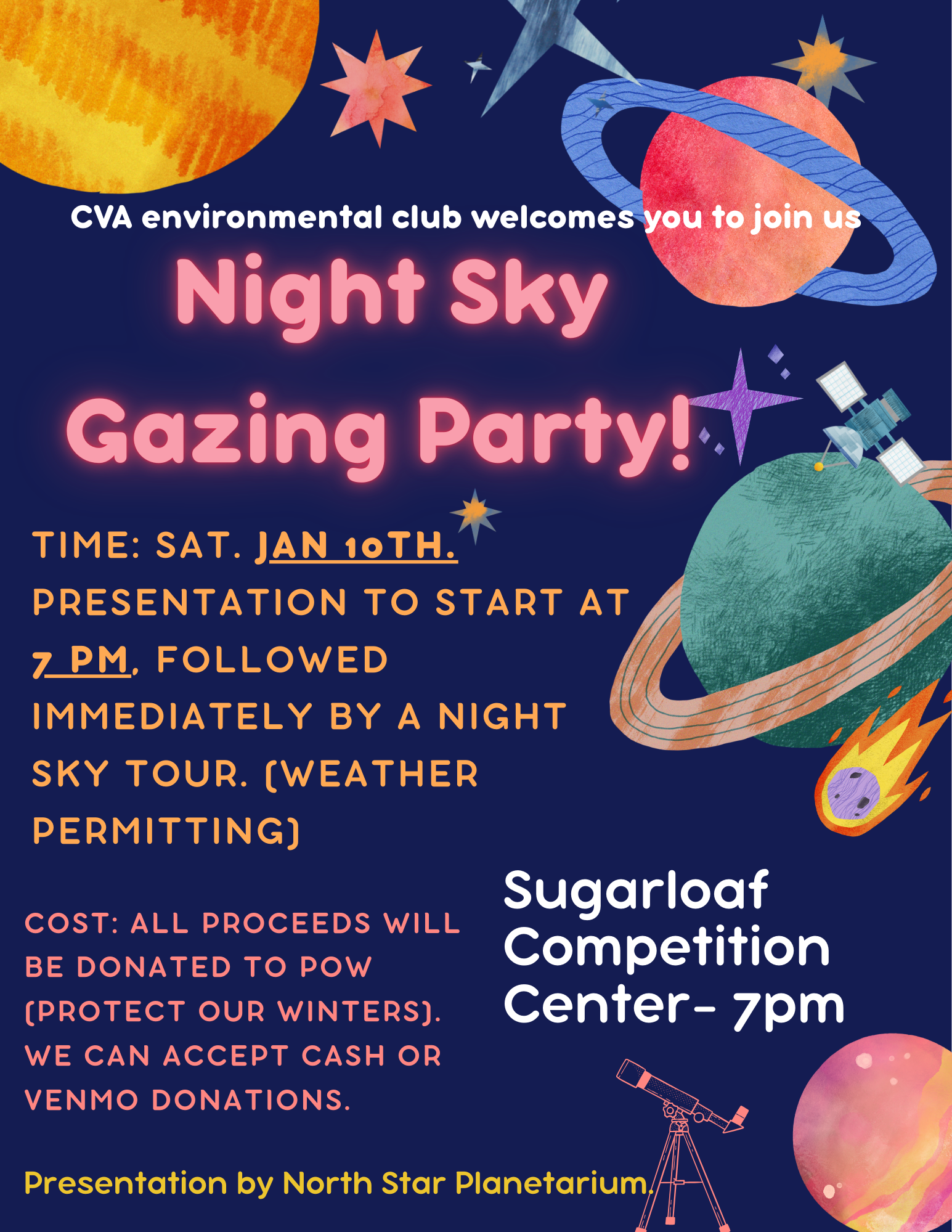 Cost for this event is by donation. Hosted by the Carrabassett Valley Academy Environmental Club, all proceeds will directly benefit the non-profit Protect Our Winters (POW). Cash and Venmo donations accepted upon entrance.